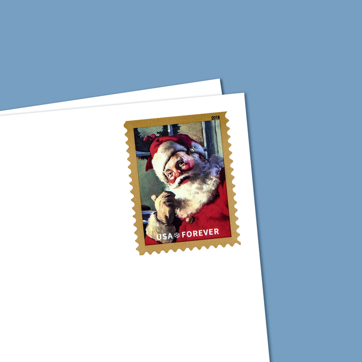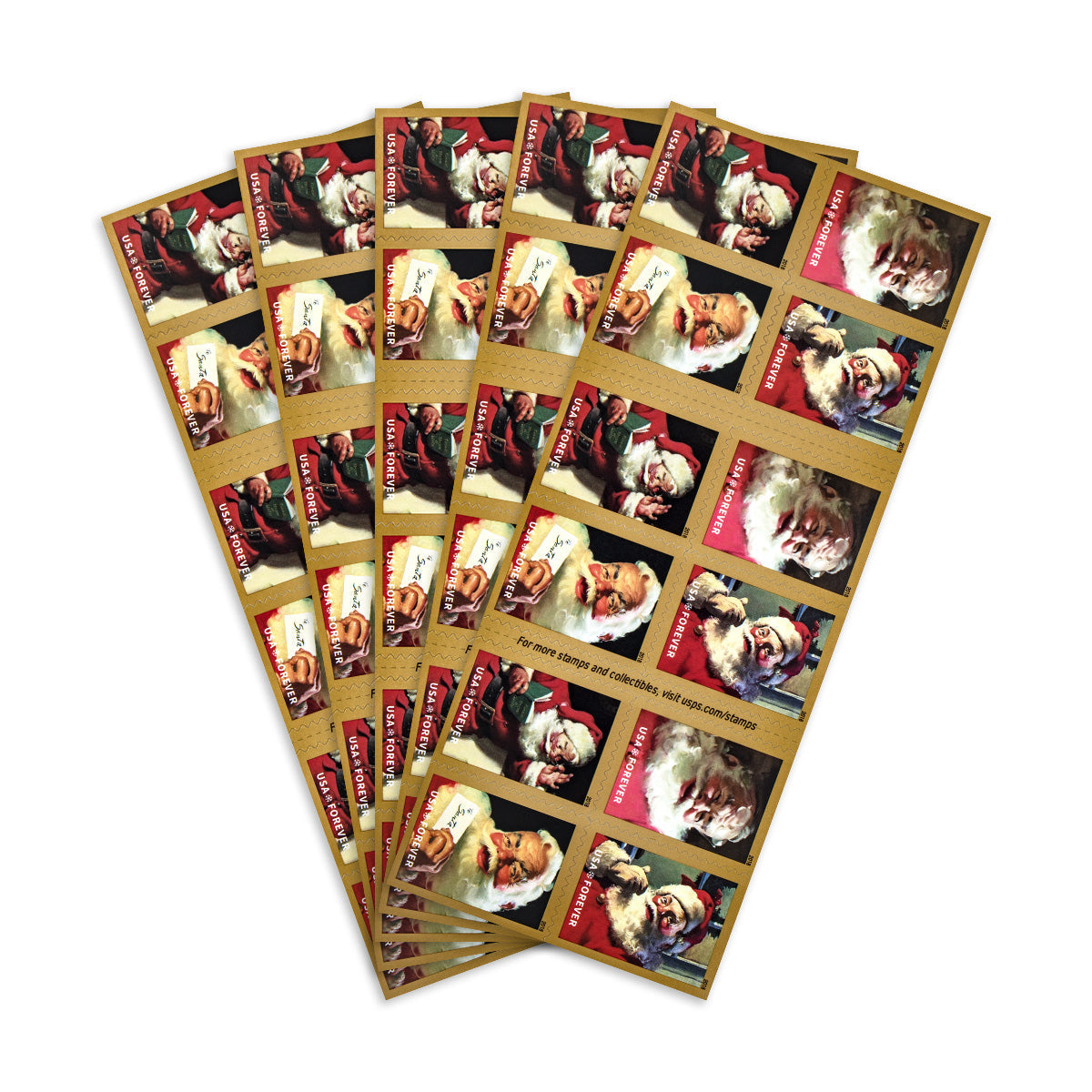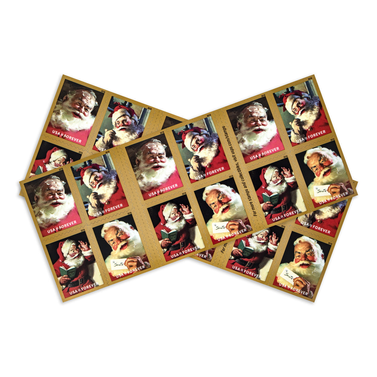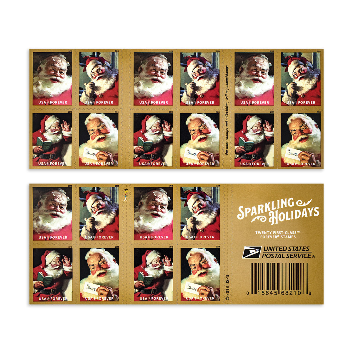 The Sparkling Holidays stamps, sold in booklets of 20, feature four classic portraits of Santa Claus. Taken from larger paintings created by Sundblom, these vintage images were originally published in ads for The Coca-Cola Company from the 1940s through the early 1960s. Sundblom is credited as the individual who most refined the modern image of Santa.
